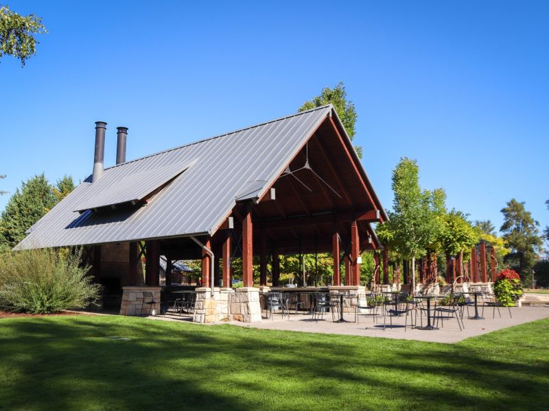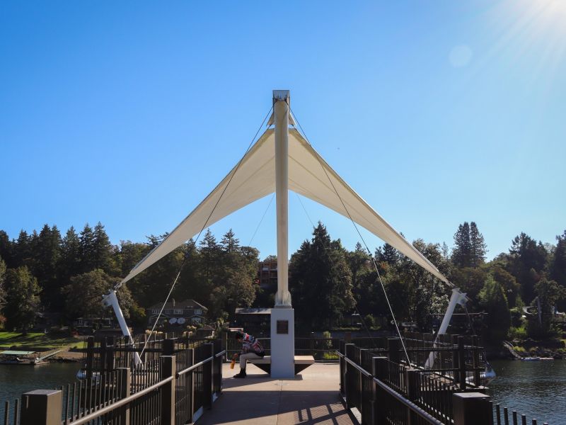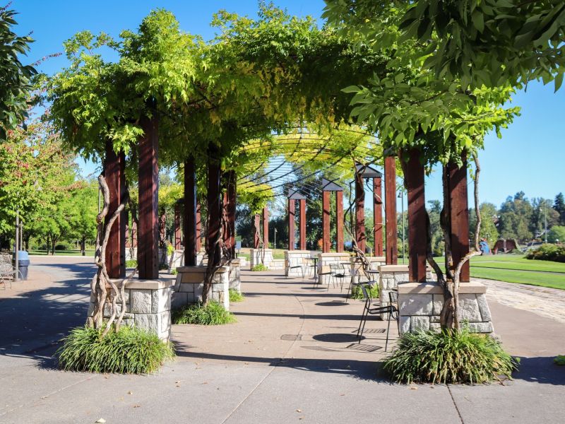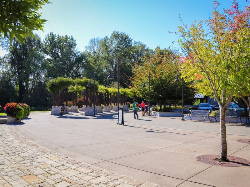 The park features sweeping lawns with paths running parallel to the river, a picnic pavilion, and a variety of public art designed to complement the surrounding environment. Other art pieces range from a war memorial to interactive pathway structures, metal work inspired by the Willamette and a ring of basalt columns etched with inscriptions from the writings of William Stafford, a famous Oregonian poet. Additionally, the park boasts a grassy amphitheater and stage that provides the City with a venue to host things like summer concerts and community events.